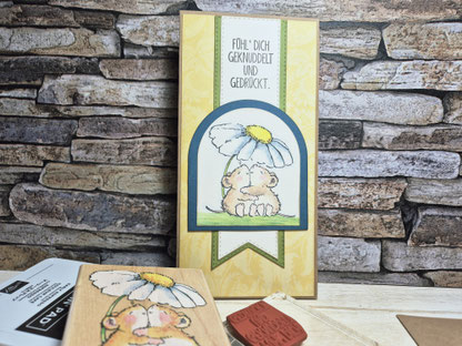 Heute ist eine Karte entstanden, die direkt ins Herz geht: Zwei süße Mäuschen in einer liebevollen Umarmung und der Stempeltext „Fühl’ dich geknuddelt und gedrückt“ machen sie zur perfekten