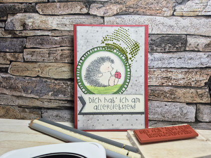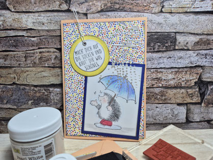 Heute habe ich eine Karte gebastelt – mit dem kleinen Penny Black Igelchen, der tapfer seinen Regenschirm hält. Passt perfekt zum aktuellen Wetter, oder?